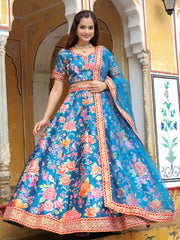 Make a statement with this vibrant and Trending Royal Blue Lehenga Choli from ResellerMart. Crafted from luxurious Art Silk and featuring a captivating, multi-colored print, this ensemble is the ideal choice for Sangeet, Mehendi, Summer Weddings, or Fusion Party events.