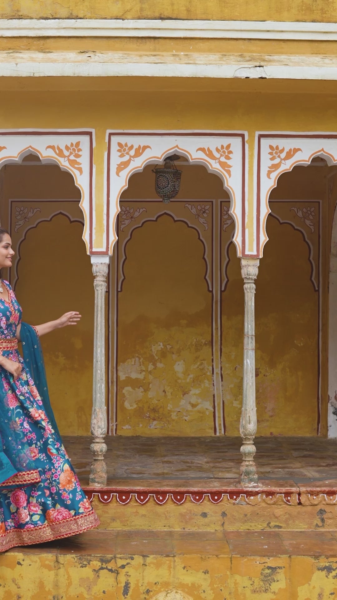 Vibrant Focus: The Multi-Color Floral Print against the blue background ensures you stand out, ideal for bright Daytime or early Evening celebrations.