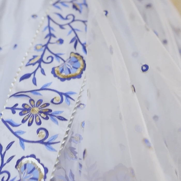 Step into the spotlight with this breathtaking White Satin Lehenga Choli from ResellerMart. Featuring a striking contrast of crisp white with beautiful Royal Blue floral digital print and intricate embroidery, this piece is the perfect blend of traditional artistry and contemporary style. It’s an ideal choice for pre-wedding functions, sophisticated festive gatherings, or high-end parties.